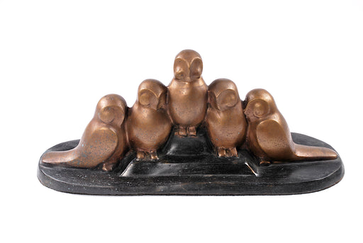 scultura in bronzo moderna cinque gufi su base sempre in bronzo