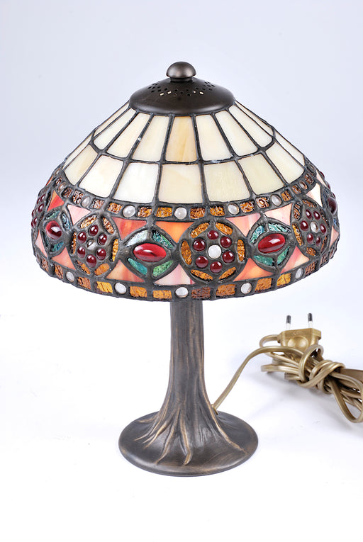 Lampada Tiffany completa composta di base tronchetto alta 28 cm. in ottone invecchiato e vetro Tiffany diametro 20 cm. con cabochon colorati.
