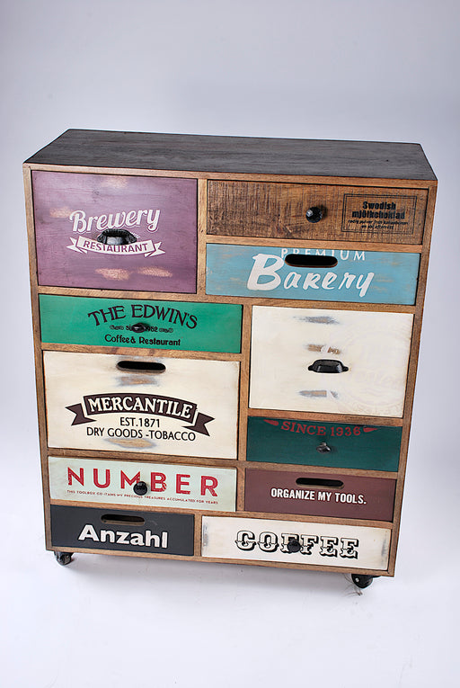Mobile cassettiera in legno con 11 cassetti diversi per forma ,colori e scritte. I cassetti hanno anche i pomoli diversi ed è dotato di pratiche ro...