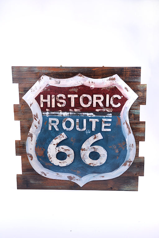 Pannello in rilievo ferro e legno ROUTE 66 dipinto a mano
