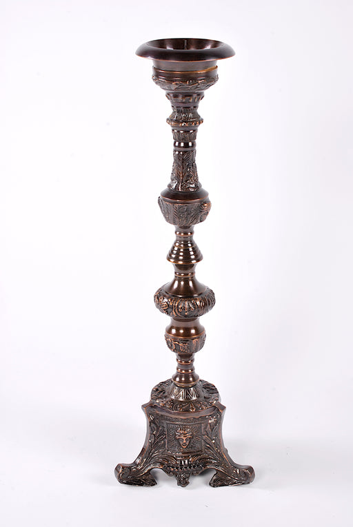Candelabro in ottone bronzato massiccio appoggio su tre piedini , motivi floreali in rilievo. Misure: base triangolare 14x14 cm, altezza 44 cm
