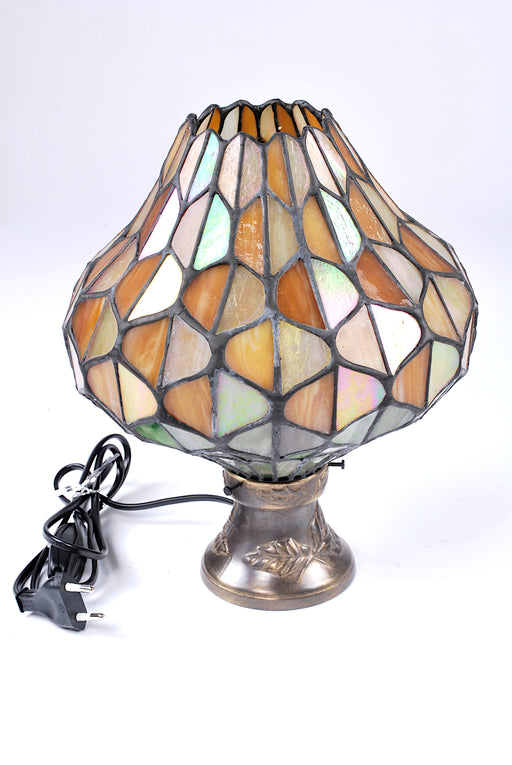Lampada Tiffany completa composta da base alta 8 cm. in ottone invecchiato e vetro Tiffany diametro 25 cm. ambra. Altezza lampada completa 28 cm.