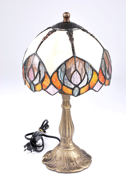 Lampada Tiffany completa composta da base tronco con foglie alta 36 cm. in ottone invecchiato e vetro Tiffany diametro 20 cm. beige con orlo decorato.