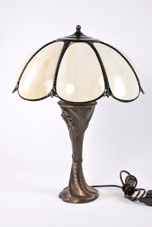 Lampada Tiffany completa composta da base tronco con donna in ottone invecchiato e vetro Tiffany diametro 40 beige .